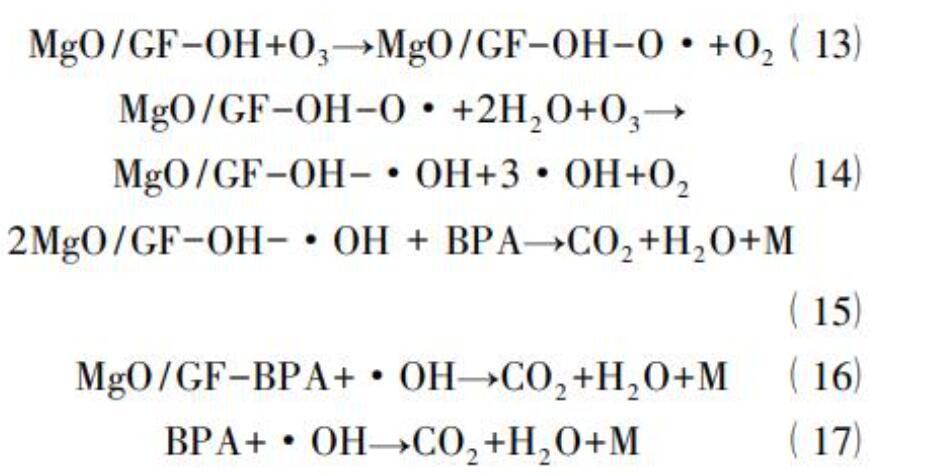 Zhang等利用高比表面積、可折疊的石墨氈(GF)為載體,采用等體積浸漬法制備了MgO/GF催化劑。在中性條件下降解雙酚A(BPA)的過程中發(fā)現(xiàn),與單獨臭氧化過程相比,加入MgO/GF催化劑可以使BPA和COD的去除率分別增加40.0%和31.6%。通過加入羥基自由基猝滅劑———叔丁醇,間接證明了MgO/GF/O3體系主要遵循羥基自由基的反應(yīng)機理。同時對反應(yīng)過程中溶解臭氧濃度進(jìn)行檢測,發(fā)現(xiàn)加入催化劑后溶液中的臭氧濃度始終處于較低水平。因此,作者認(rèn)為MgO/GF可以提高臭氧化效率的原因主要是催化劑表面的堿性位可以促進(jìn)臭氧分解產(chǎn)生·OH,如下述方程式所述。